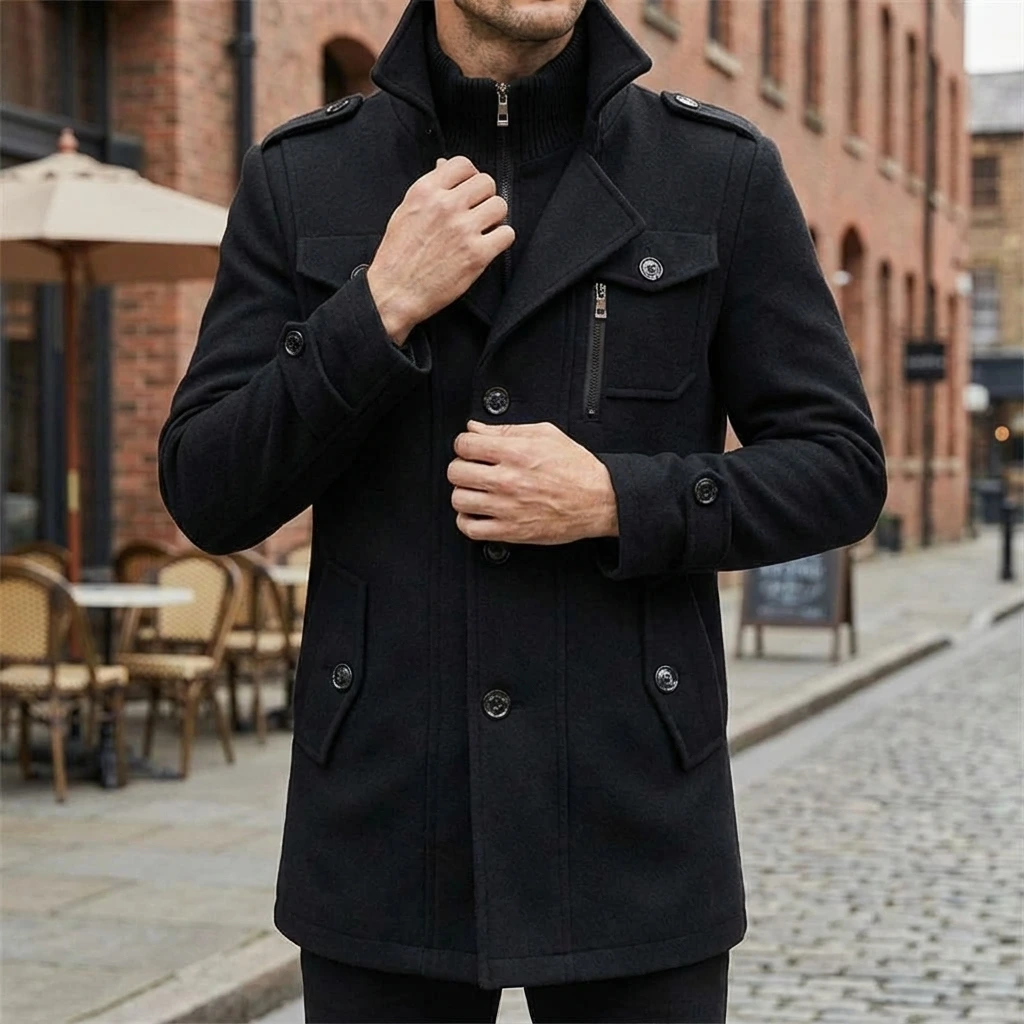 This Elijah men’s structured coat features a smooth, refined exterior designed for a sharp everyday look. The tailored construction creates a clean silhouette that layers comfortably over knitwear or lightweight tops. A classic collar and button front closure add a timeless finish, while subtle zip detailing provides functional contrast. Designed for daily wear, this coat balances structure and versatility, making it a reliable option for cooler days and transitional seasons.