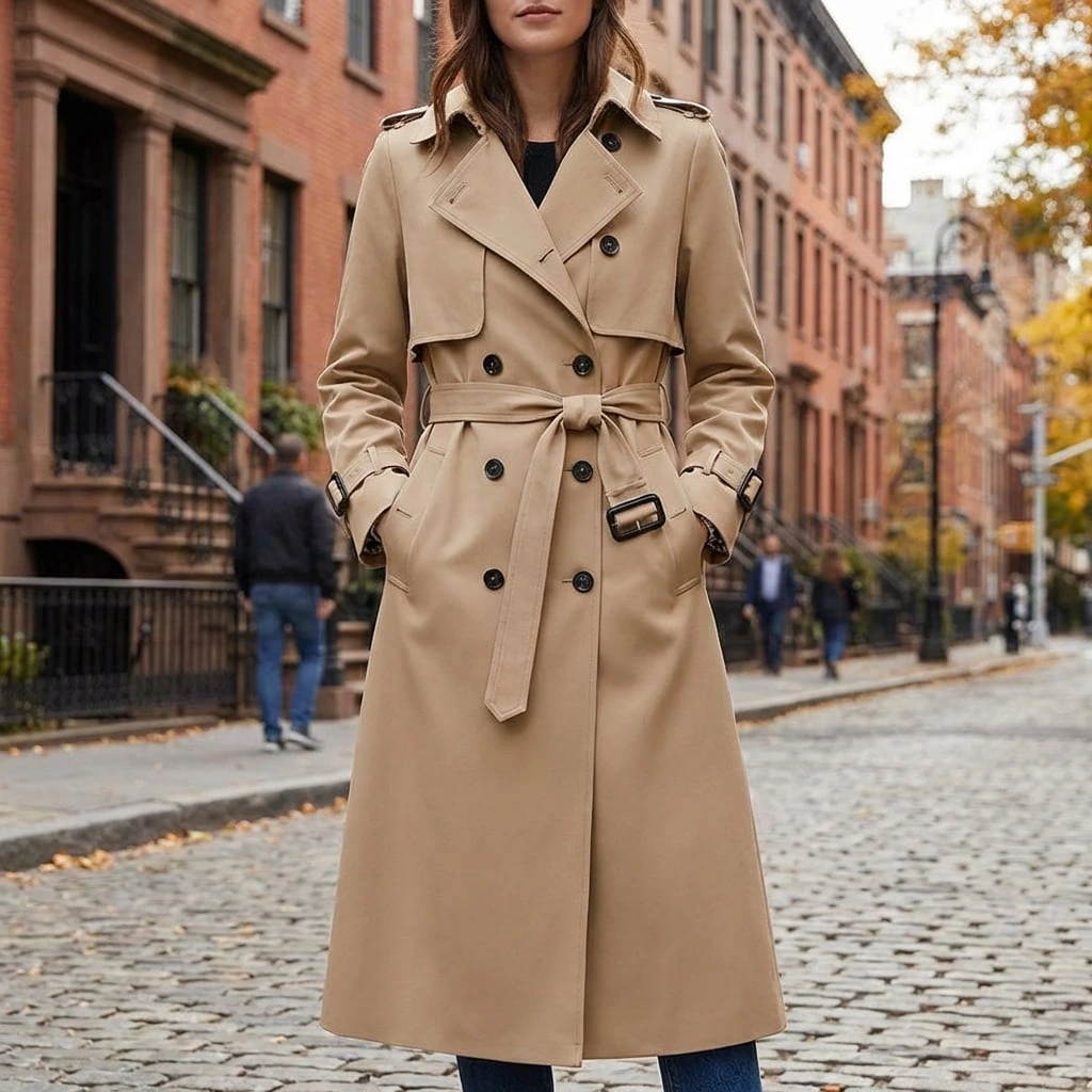 Women’s double breasted trench coat with belt, long silhouette, and side pockets. A polished coat for fall layering, travel, and everyday wear.